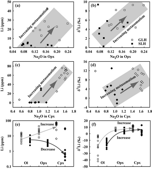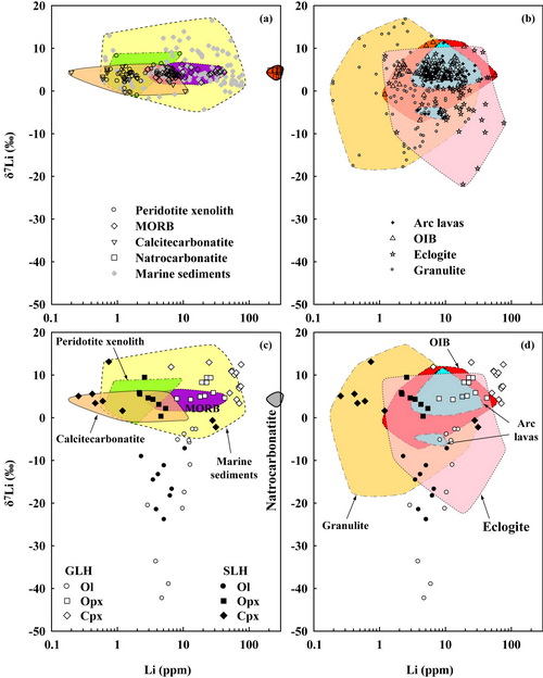 本次研究首次报道了碳酸盐交代的地幔橄榄岩中矿物的Li同位素组成;发现了岩石圈地幔中异常高Li含量低δ7Li的特征;提出了造成这种特征的两种可能机制:I-Li同位素在碳酸盐交代过程中进入矿物的优先级与碳酸盐交代过程不同;II-地幔中可能存在极低δ7Li的储库,如榴辉岩。