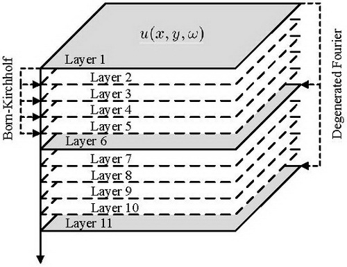 地质与地球物理研究所地球深部结构与过程研究室博士后魏伟与合作导师符力耘研究员对此开展了相关研究。他们提出了一种新的多频率快速聚焦束分析方法,仅需进行少量频率的聚焦束分析,辅以快速的频率插值算法(图1),直接得到多频率聚焦束分析结果。为了进一步提高复杂介质条件下聚焦束分析的效率,该方法结合使用大步长Degenerate Fourier延拓加小步长Born-Kirchhoff插值算法进行波场延拓算法(图2)。国际勘探地球物理学泰斗、荷兰Delft理工大学Berkhout教授认为,该方法以一种巧妙的方式大幅度提高了聚焦束分析的运算效率,增强了聚焦束方法的工业应用价值(见附件Comment by Prof. Berkhout.pdf)。