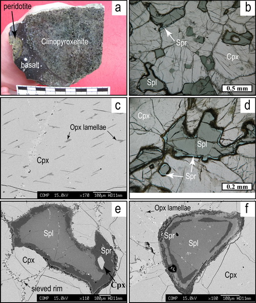 图1:华北克拉通北缘汉诺坝地区含假蓝宝石的单斜辉石岩的矿物岩石学特征. Cpx, 单斜辉石; Opx, 斜方辉石; Spl, 尖晶石; Spr, 假蓝宝石