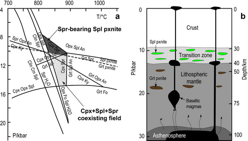 他们对该样品进行了详细的矿物学、岩石学分析,与汉诺坝地区的橄榄岩、辉石岩和麻粒岩中的矿物进行了对比,也与世界上其它地区含假蓝宝石的幔源样品和变质岩样品进行了矿物化学对比,同时对幔源假蓝宝石存在的温压条件进行了制约。结果表明幔源假蓝宝石的形成需要极苛刻的温度(800-900 °C)和压力(8-15 kbar)条件,并需要富Si-Al熔体与地幔岩的相互作用(图2),与汉诺坝地区产出辉石岩的地幔条件相一致。这可能就是幔源假蓝宝石极为稀少的原因。
