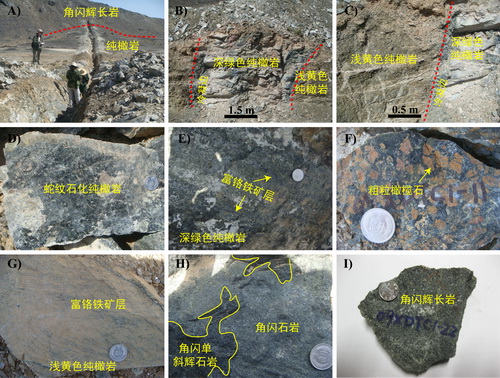 图2:峡东镁铁-超镁铁岩体的野外出露情况及岩石学特征