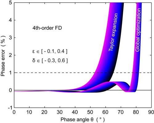 红色代表优化前的精度,蓝色代表全局优化后精度。左侧为二阶有限差分算子,右侧为四阶有限差分算子,从左到右依次对应弱各向异性、强各向异性以及极端各向异性三种不同情形。