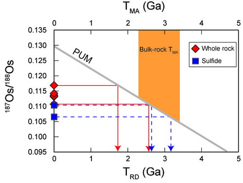 图1:鹤壁橄榄岩包体187Os/188Os 与模式年龄图。 红色为本次研究中全岩的Re-Os同位素特征及对应的TRD年龄,蓝色方框为前人获得鹤壁地幔包体中硫化物的Os同位素结果。
