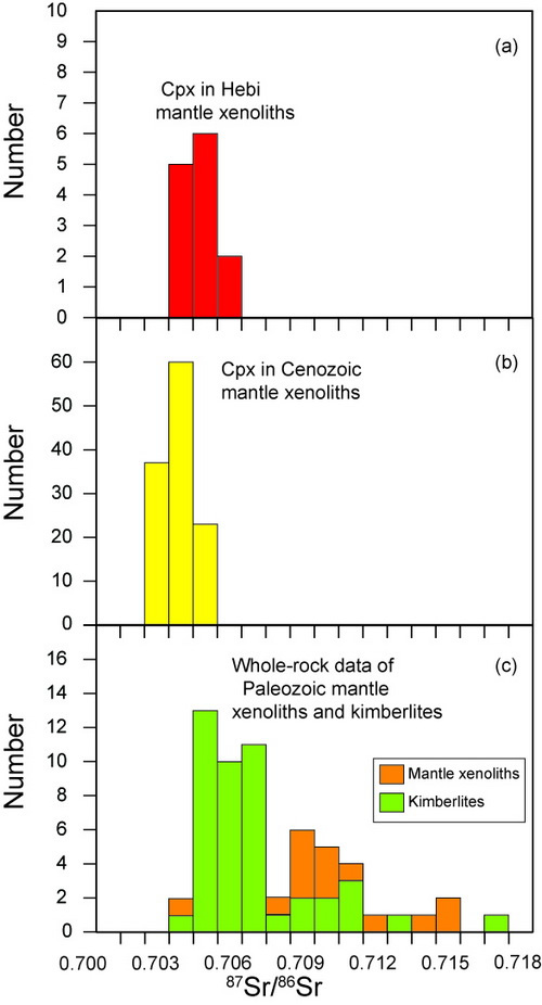 图2 :鹤壁橄榄岩包体中单斜辉石Sr同位素(a)与华北克拉通新生代地幔包体中单斜辉石的Sr同位素(b)、古生代金伯利岩及其地幔包体的Sr同位素(c)的对比。