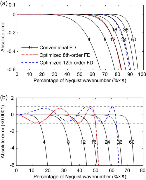 图1:系数优化前后的精确频谱范围对比。黑色实线代表常规有限差分方法,线上的数字代表算子阶数;红色和蓝色虚线分别代表优化的8阶和12阶有限差分算子。(b)为(a)的局部放大。由图1(a)可见,优化的8阶算子同常规的12阶算子十分接近,优化的12阶算子同常规的24阶算子十分接近。