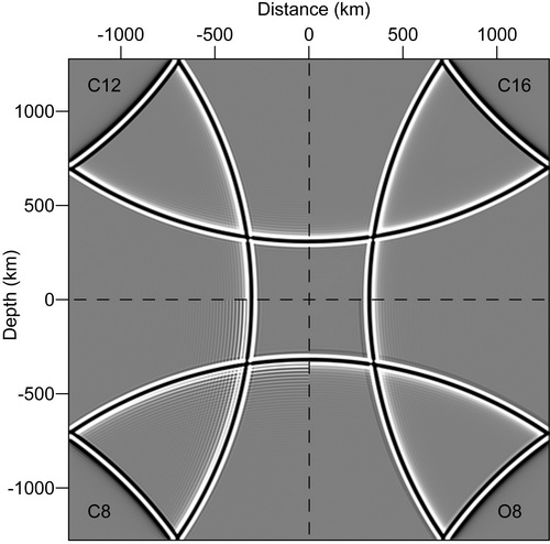 图2:优化系数前后的波场快照对比。字母C代表常规有限差分方法,字母O代表本文的优化方法,字母后面的数字代表算子的阶数。不难看出,常规的8阶算子具有较强的数值频散,优化的8阶算子同常规的12阶算子十分接近,均没有出现数值频散的干扰(以常规的16阶为参考)。