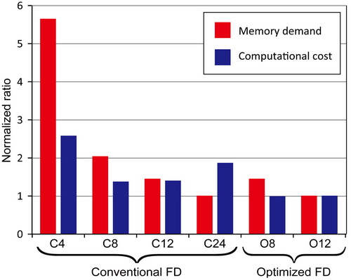图4:优化方法和常规方法在计算量和内存需求方面的对比。字母C代表常规的方法,O代表优化的方法,字母后面的数字代表算子的阶数。不难看出,优化后的方法既具有相对少的内存需求又具有相对高的执行效率。这种优势对于三维情形更加明显。