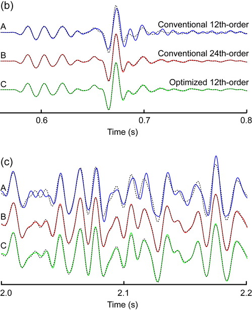 图3:优化系数前后的波形对比。虚线代表常规的36阶算子,蓝、红、绿分别代表常规的12阶、常规的24阶、优化的12阶有限差分方法。不难看出,常规的12阶算子已经出现了明显的数值频散,而优化的12阶算子同常规的24阶算子十分接近,均没有出现数值频散的干扰(以常规的36阶为参考)。随着传播时间增大,常规12阶算子的频散也明显加强,而优化的12阶算子一直与常规24阶算子保持一致,频散并未加强。