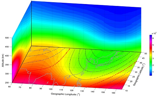 电离层经度变化的起源一直以来都是国际高层大气物理研究的热点之一,而不同纬度带的经度变化特征及机制又完全不同。低纬电离层主要受E(电场)×B(磁场)电动力学过程的影响。中低纬的各种潮汐风场结构和电导率经度差异会导致电离层电场的经度差异,从而导致电子浓度的经度变化,如低层大气中DE3的非迁移潮汐过程会导致低纬电离层出现波数为四的经度结构。与低纬相比,中纬电离层经度差异绝对变化小,但相对差异较大。最近,MIT学者利用长达数十年的Millstone非相干散射雷达测量的电离层资料和美国密集的GPS数据证明:即使北美地区都位于近磁极位置,其东西部电离层日变化仍然存在较大差异,该差异与北美地区磁偏角对纬向风场的调制作用有关(East-West Coast differences in total electron content over the continental US, Geophys. Res. Lett., 38, L19101, 551 doi:10.1029/ 2011GL049116)。北半球中纬磁偏角差异较大的区域除了北美地区,另一个在远东地区。