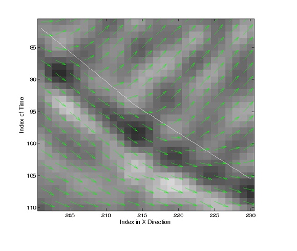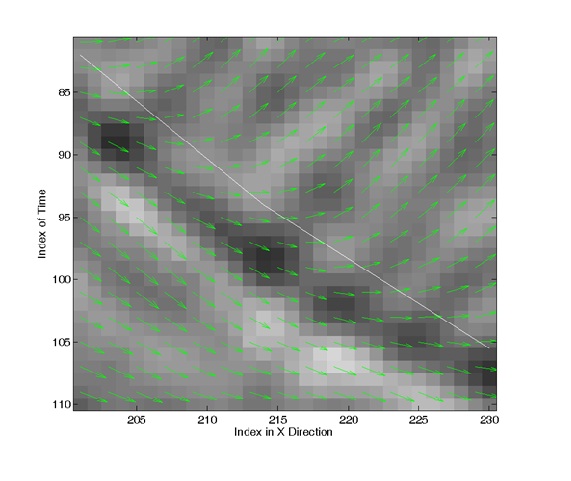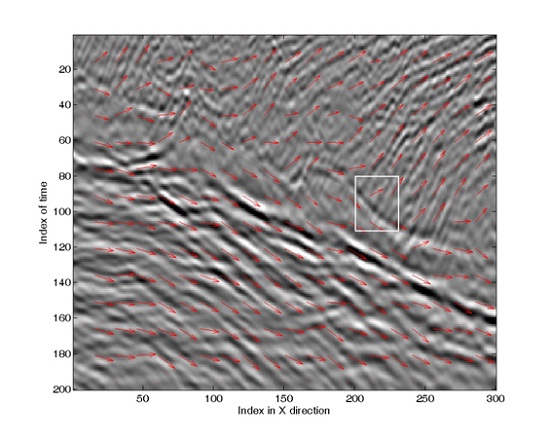 图1 地震偏移剖面,在每一个网格点通过结构张量计算构造走向