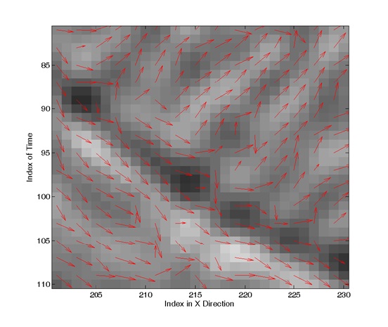 800彩票“地震波传播与成像”学科组刘伊克研究员最近提出了地球物理资料的矢量中值滤波方法来压制噪声。该方法将地球物理数据看成多维矢量,通过矢量空间的一范数与二范数计算分量之间的相关性和矢量之间的依随性。研究结果表明,地球物理资料的矢量中值滤波方法,通过考虑分量的相关性可以有效地保持断层的边界。图1是一个地震偏移剖面,箭头是通过结构张量计算出的构造走向(event)。为了看清楚中值矢量滤波效果,将白色矩形区域放大(图2),图3是平均方法的滤波结果,可以看到将局部噪声去除,走向形成南北东西2个大方向,但白线划定的不整合面两侧模糊,没有保持断层的边界,图4是中值矢量方法,能很好地保持不整合面的边界。