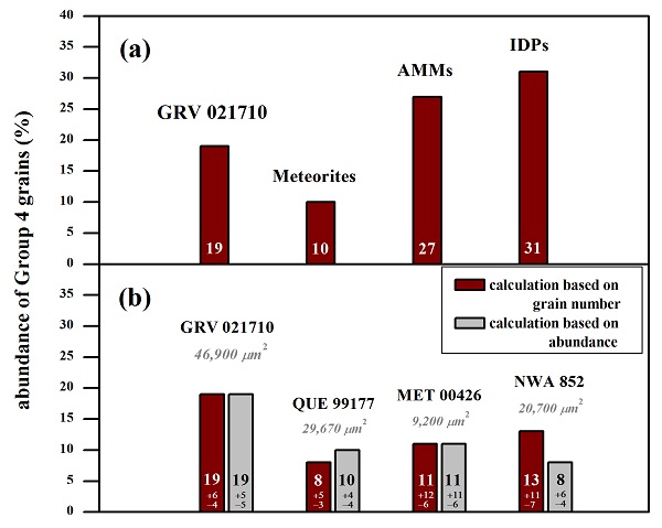 图1 (a)GRV021710陨石中超新星成因前太阳富氧颗粒的丰度与其它地外样品的比较;(b)与其它CR型碳质球粒陨石的比较。