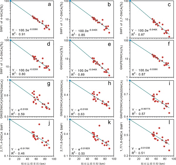 所有的回归线均由实测数据计算。参照点处(x=0 km)的二次运移分馏指(100 %)及其比值(1)为理论模型值。二次运移分馏指数及其几何平均值和比值均与运移里程密切相关且回归线全部穿过模型点,表明理论模型与实测数据相吻合。