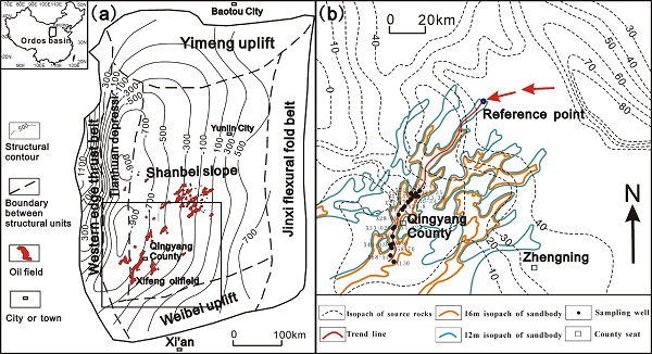 (a)三叠系延长组长8段顶部构造与油田分布图;(b)盆地西南部长7段烃源岩(厚度的单位为米)、长8段砂体与取样井位分布图。
