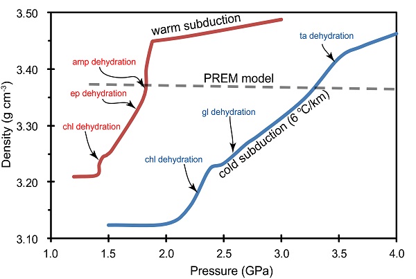 洋壳的成分主要为MORB,它俯冲到深部地幔会转变为蓝片岩和榴辉岩。大量的高温高压实验研究表明,洋壳榴辉岩的密度大于周围地幔,因而它很难通过自身浮力而折返到地表。然而,自然界大洋俯冲带中出露了大量的洋壳榴辉岩,表明至少有部分的洋壳与俯冲板块拆离而折返至地表。近三十年来,众多研究学者认为洋壳榴辉岩的折返必须借助于其它低密度岩石,如地幔楔蛇纹岩或增生楔变沉积岩。然而,深俯冲洋壳的折返机制仍不明确,根源在于对俯冲洋壳自身在浅部地幔的密度演化仍缺乏系统的认知。