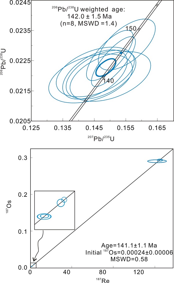 显微矿物学研究表明从石英-黄铁矿脉中挑选出的锆石属于捕获的岩浆锆石,形成于142 Ma(图1上),代表着一期岩浆热液事件,随后发生了大规律的硫铁矿化(黄铁矿)。黄铁矿属于低含量高放射性硫化物,其Re的含量一般较低。银家沟黄铁矿的Re-Os同位素研究表明其Re的含量变化较大,并给出了一组较好的等时线年龄,为141 Ma(图1下),表明硫铁矿化形成于早白垩世。该期矿化事件的时间要明显晚于斑岩型Cu-Mo矿化(145~148 Ma)。