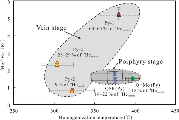 银家沟矿床主要发育两类硫铁矿化,一是早期的石英-黄铁矿脉,另一类为大规模的黄铁矿脉(层),含有少量的石英。黄铁矿及其中的流体包裹体具有很好的红外透光性。黄铁矿的红外显微测温和He-Ar同位素研究表明:早期的黄铁矿含有高盐度流体包裹体,其均一温度大于350 °C,具有较为恒定的He同位素组成(1.39~1.78 Ra,Ra=1.39×10-6,图2),可能代表着从深部岩浆房出熔成矿流体的He同位素组成(图3);主成矿期黄铁矿主要为中温热液(260~350 °C),盐度变化较大,介于4~21 wt. % NaCl,其He同位素组成变化于0.80~5.26 Ra(图2),显示出了明显的混合热液特征(图3)。He-Ar同位素指示有大量的地幔氦参与到了银家沟多金属矿化事件中(地幔4He=9~65 %)。另外,与石英中成矿流体的对比研究表明,斑岩型Cu-Mo矿化与成矿流体的相分离(沸腾)作用有关,而硫铁矿化主要是因成矿流体的混合而沉淀。