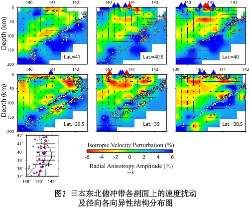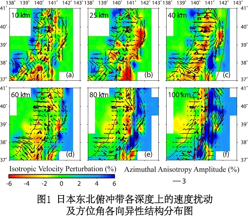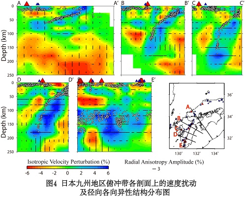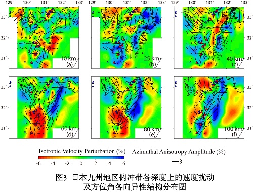 800彩票地球深部结构与过程研究室地震学学科组王建副研究员与日本东北大学赵大鹏教授合作,利用区域地震的P波震相数据对日本俯冲带地区进行了方位及径向各向异性层析成像研究。研究结果表明俯冲带内部的各向异性结构非常复杂,日本东北俯冲带(图1和图2)与九州地区俯冲带(图3和图4)的各向异性结构存在着异同,例如:弧前地幔楔中存在与海沟平行的方位角快速方向;弧后地幔楔中主要表现为与海沟垂直的方位角快速方向;俯冲的太平洋及菲律宾板块表现为与海沟平行的方位角快速方向;负的径向各向异性主要存在于火山链下方地幔楔中的低速体中,而正的径向各向异性(水平P波速度>垂直P波速度)结构主要存在于俯冲板块内;日本东北地区火山链下方地幔楔中存在着与海沟平行的方位角快速方向,而九州地区火山链下方似乎不存在此各向异性特征等。这些研究结果为俯冲带的岩石学及动力学研究工作提供了新的地球物理证据。