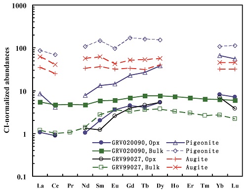 火星陨石是人类目前唯一能获得的来自火星的岩石标本。我国在南极格罗夫山发现了2块火星陨石,编号分别为GRV 99027GRV 020090,均属二辉橄榄岩质类型。包括GRV 99027在内的绝大多数二辉橄榄岩质火星陨石具有完全相似的岩石矿物学和地球化学特征,可能来自火星中等亏损的相同岩浆源。GRV 020090(图1)是第一块富集型二辉橄榄岩质火星陨石,随后发现RBT 04262也具有相似的轻稀土富集特征,它们代表了火星表面新的火成岩体。富集型二辉橄岩质火星陨石可能代表了强烈分异的残余岩浆,或由于受到火星壳物质的混染,或是火星富集幔的部分熔融产物。