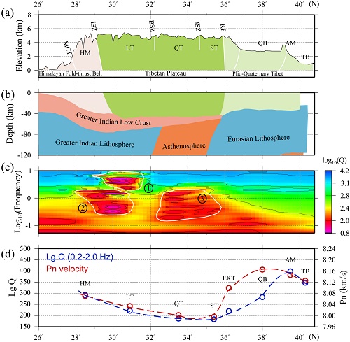 (a)地表地形;(b)地壳-上地幔结构示意;(c)宽频带Q值分布;(d)地壳Lg波Q值与上地幔顶部Pn波速度变化。