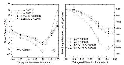 为了解决这种争议,前人提出高温高压下bcc结构存在重新稳定的可能,这来自于两方面的因素:(1)高温使得熵的作用增大,热力学上有利于较为疏松有序的bcc结构;(2)bcc结构在高压下存在的力学不稳定问题,可由高温下的非谐性效应、少量硫、碳、硅、氧等轻元素掺杂效应等因素有效克服。虽然这两方面趋势已得到大家认可,但目前对bcc结构在地球内核条件下的稳定性还没有准确判断。