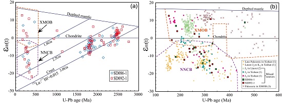 800彩票岩石圈演化研究室博士生徐建强在导师李忠研究员的指导下,重点采用砂岩碎屑和重矿物高分辨率物源分析方法研究了鲁西隆起北部侏罗系碎屑物源,并综合探讨了华北东部侏罗纪构造古地理演化。研究结果显示,侏罗系砂岩样品的前寒武纪碎屑锆石U-Pb年龄及其Hf同位素组成与广泛出露于北部的华北克拉通基底一致(图1)。根据缺乏新元古代中期(700~850Ma)岩浆年龄和三叠纪变质年龄的事实,他们排除了扬子板块及现今临近于鲁西隆起东南部的苏鲁造山带物质来源。显生宙年龄(256~393Ma)记录的晚古生代岩浆活动均未发现于鲁西隆起及其邻近地区,而依据其εHf(t)值特征可分为-21.9~-3.0和-1.0~+12.7两部分(图1),可分别与华北北缘和兴-蒙造山带对比。综合砂岩碎屑模式以及沉积体系分析指示,从早-中侏罗世到晚侏罗世来自华北北缘和兴-蒙造山带的碎屑物源具有增长趋势。