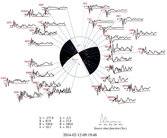采用下半球投影,同时给出了点源模型的P波垂向位移理论图(红线)与资料(黑线)的拟合情况。图形下方给出了两组节面解(左下,λ,δ,θ,h分别表示错动倾伏角、断层倾角、断层走向、震源深度)和点源模型的震源时间函数(右下)。