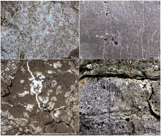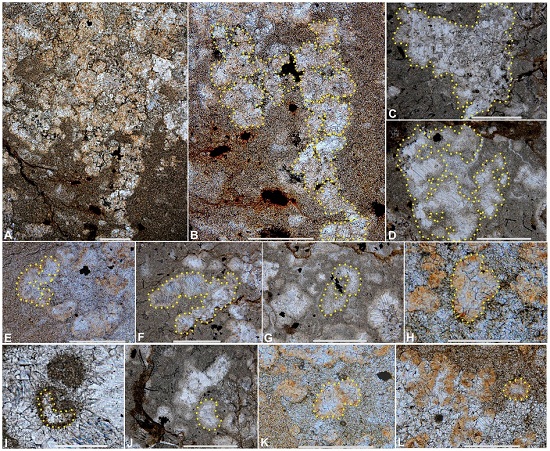 图2 树枝状和斑点状微生物岩中的微囊藻模铸化石,呈树枝状以及各种不规则形状