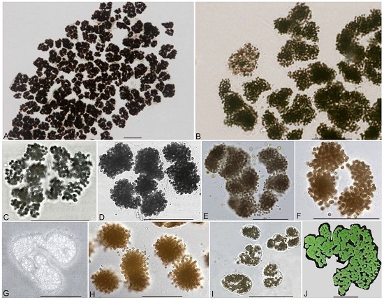 图3 现代微囊藻的群体,呈树枝状等各种不规则形态