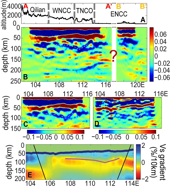 图2 (A)沿A-A’和B-B’剖面地形;(B)两条剖面S波接收函数偏移图像;(C)A-A’剖面S波接收函数偏移图像(色标不同于B);(D)A-A’剖面P波接收函数偏移图像;(E)由面波频散反演获得的Vs垂直梯度