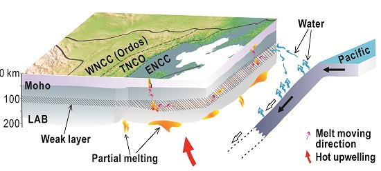 与大洋岩石圈相比,大陆岩石圈结构普遍具有强烈不均匀性。这种岩石圈结构的不均匀性如何影响大陆的构造演化是大陆动力学研究的一个重要领域。大量研究发现,大陆岩石圈结构的横向不均匀性,比如早先存在于岩石圈中的构造薄弱带,在大陆岩浆-构造事件过程中,因其力学强度较低而常常成为受热强烈和应变集中的区域,从而对大陆构造演化起到重要的控制作用。对大陆岩石圈结构垂向不均匀性的研究表明,大陆地壳结构随深度变化明显,且这种变化与区域构造演化密切相关。然而,对更深部的大陆岩石圈地幔结构的垂向变化的认识仍然比较缺乏。