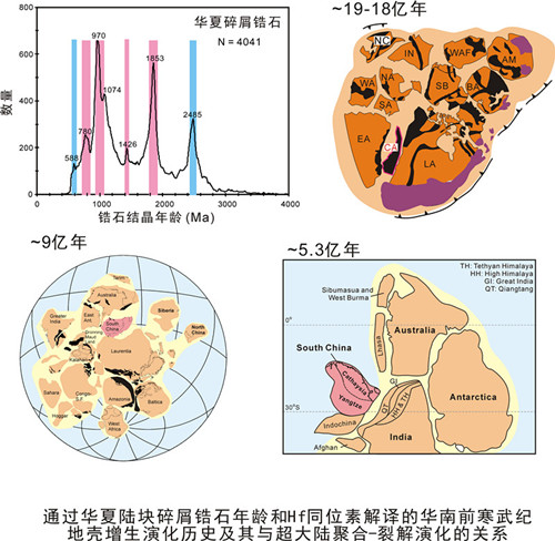 华夏陆块的前寒武纪地壳演化与全球超大陆聚合-裂解密切相关。通过碎屑锆石年龄谱图特征和其他地质记录的对比发现,在~19亿年前 Columbia/Nuna超级大陆聚合期间,华夏陆块最初和可能是介于东南极-劳伦和澳大利亚三个大陆之间的造山带(图一)。在~10-8.9亿年前Rodinia超大陆聚合时,华夏与扬子陆块通过四堡造山带聚合形成了统一的华南大陆。华南大陆联接劳伦-澳大利亚-东南极之间,位于Rodinia超大陆的核心。新元古代晚期,华南很可能通过泛非期碰撞造山带与印度相连,成为冈瓦纳大陆的一部分。