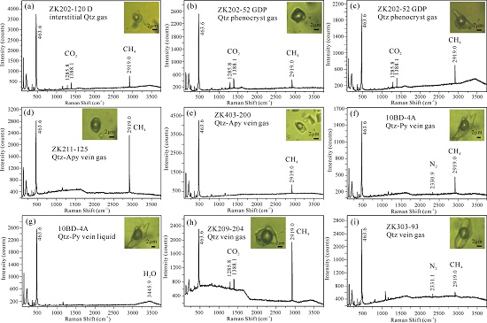 图1  包古图不同产状石英代表性流体包裹体激光拉曼光谱