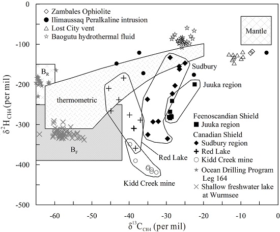他们进一步开展了显微观察,表明成矿岩石中斜长石存在明显的溶蚀边。微区成分分析显示,斜长石化学成分显示出明显的AnFeO正相关关系,同时剖面组成显示较大的An变化范围,以及重复性AnFeOSr同位素逆向环带(图2)。以上结果一致表明深部岩浆房发生了重复性基性岩浆注入,伴随该过程,可能带来了大量Cu等成矿元素,造成成矿元素逐步富集,最终形成矿床。详细的激光拉曼测试显示,早期岩浆阶段流体CCO2的形式存在,晚期岩浆阶段和热液流体中的C转变为CH4;流体包裹体CH4C-H同位素组成(δ13C = -28.6~-22.6‰δD = -108.0~-59.5‰),显示明显不同于生物成因和热解成因的CH4同位素组成,而与费托反应(CO2 + 4Η2 CΗ4 + 2Η2Ο)成因CH4同位素组成相似(图3)。因此,他们认为包古图斑岩铜矿成矿流体中的CH4是由岩浆阶段的CO2经费托反应转变而来,而非来自含碳地层的热解作用。