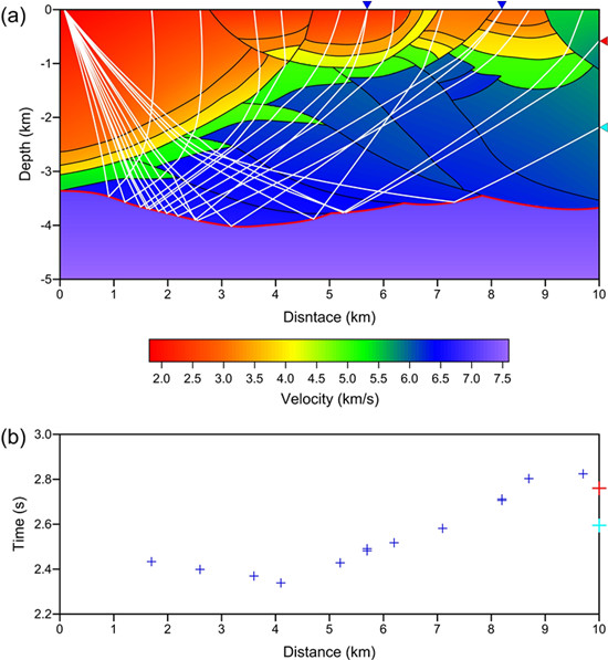 图1:(a)二维复杂地质速度模型上的地震波传播路径;(b)地震波走时