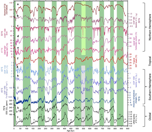 (a) 亚洲冬季风的复合粒度(>32 μm)记录;(b) ODP 980孔底栖有孔虫δ13C记录;(c)“冰筏碎屑带”内IOPD U1308Si/Sr比值;(d)(e)DSDP 607 孔碳酸盐含量和冬季海表温度;(f) 热带海表温度复合记录;(g)−(j) 来自南半球的记录;(g) ODP 1123 孔根据Mg/Ca比值计算的大洋底流水温;(h)(i) ODP 1090孔底栖有孔虫δ13C和风尘铁通量变化;(j) EPICA冰心记录的气温变化;(k) 冰心记录的大气CO2记录;(l) 底栖有孔虫δ18O复合记录LR04