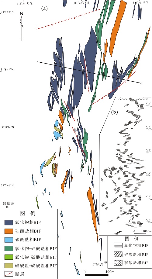 图1 (a) 袁家村BIF沉积相平面分布图;(b)据后期褶皱变形复原的沉积相分布图