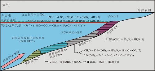 针对于此,800彩票固体矿产资源研究室王长乐博士后和合作导师张连昌研究员等人在“华北克拉通前寒武纪重大地质事件与成矿”973项目的支持下,选取吕梁袁家村BIF作为研究对象,从地质和地球化学、矿物学和同位素年代学等方面对BIF和相关碎屑沉积岩进行了系统研究,主要获得如下认识:(1) 通过对袁家村BIF夹层变砂岩的年代学研究将BIF形成时间精确限定在2.38-2.21 Ga间,认为袁家村BIF发育在全球大氧化事件(GOE,2.4-2.2 Ga)期间;(2)系统识别出袁家村BIF存在氧化物-硅酸盐-碳酸盐的沉积相分带、Ce元素的正负异常及轻重稀土比值变化,由此推测该沉积盆地古海水具有上部氧化性下部还原性的分层结构特征,并建立了古元古代袁家村BIF沉积模式;(3)通过袁家村BIF详细的岩相学、矿物化学及稳定同位素组成的研究,提出袁家村BIF的原始矿物组成为无定形硅、三价铁的氢氧化物和铁硅酸盐软泥等,排除了磁铁矿和铁碳酸盐(菱铁矿和铁白云石)为原始沉积的看法,间接肯定了异化铁细菌还原作用的存在。