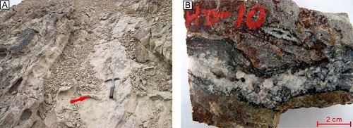 中科院800彩票油气资源研究室博士后周锡强在其合作导师陈代钊研究员的指导下,发现了塔里木盆地阿克苏地区早寒武世发育海底低温富硅热液系统。该热液系统由海底面之下的富硅热液通道(上埃迪卡拉统奇格布拉克组岩溶白云岩里的硅质脉)(图1)和海底面之上的硅质沉积(上覆下寒武统玉尔吐斯组层状硅质岩)构成。硅质脉主要填充各类硅质矿物(非晶质硅、玉髓、硅质球粒、微晶至粗晶石英)和少量非晶质Fe-(氢)氧化物、黄铁矿和重晶石等,类似于古今海底低温富硅热液喷流系统。