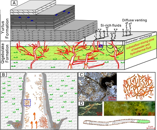 极端环境里的微生物有助于认识早期地球生命演化。地质历史时期多种环境里时有报道形态独特、易于识别的丝状微结构。这些丝状体通常被认为与微生物(如铁氧化细菌、古菌、真菌或其它未知生物)有成因联系。迄今为止,由于热液脉形式产出的微生物鲜有报道,因此人们对其生存条件、矿化过程等知之甚少。