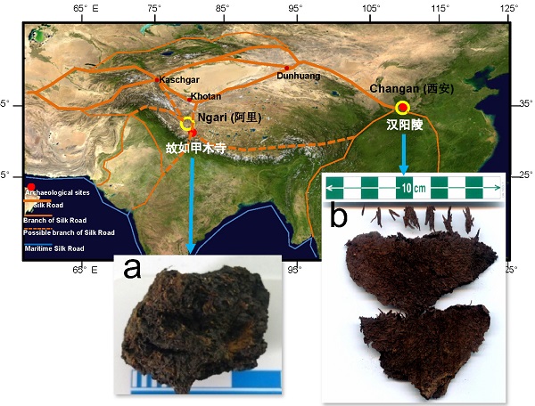 高寒环境的青藏高原不生长茶树,印度也仅有200多年的种茶历史,茶叶到达西藏阿里的可能途径,应该与距今2200多年前汉代开通的丝绸之路有关。越来越多的证据表明,丝绸之路并不只有一条路,它是由许多网状的分支组成的。阿里地区故如甲木出土的茶叶表明,至少在1800年前,茶叶已经被输送到海拔4500m的西藏阿里地区,推测当时丝绸之路有一个分支穿越青藏高原。