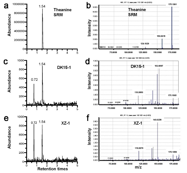 (a)、(b)分别是标准茶氨酸样品色谱、质谱图;(c)、(d)分别是西安汉阳陵考古植物样品色谱、质谱图;(e)、(f)分别是阿里故如甲木寺植物样品色谱、质谱图