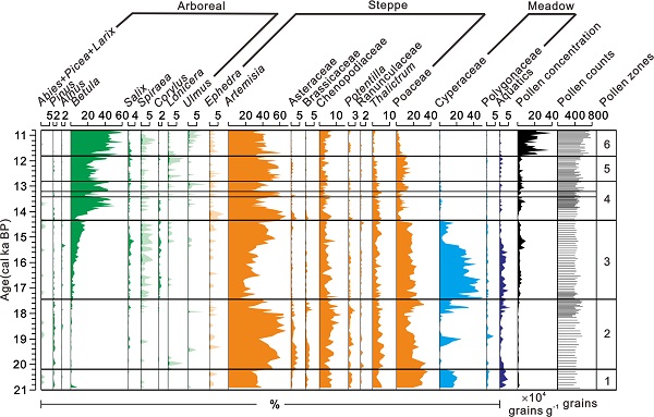 2 月亮湖沉积物岩芯记录的末次冰消期主要孢粉变化