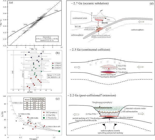 3:(a)铜矿峪斑岩锆石U-Pb谐和图;(b)铜矿峪斑岩锆石氧逸度图;(c)铜矿峪斑岩La-Yb地球化学模拟图;(d)中条山地区2.7Ga2.2Ga大地构造演化模式图