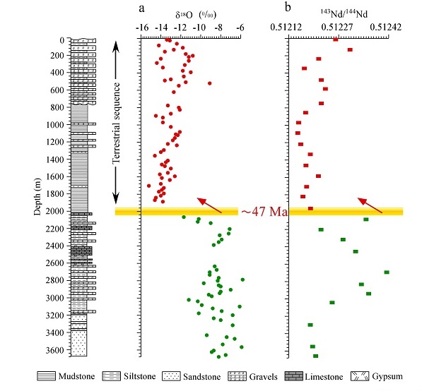 新生代地质与环境研究室孙继敏研究员与其合作者,对帕米尔东北缘前陆盆地奥依塔克剖面(图1),开展了砂岩成分、碎屑锆石的U-Pb年龄与Hf同位素、磁组构、稳定同位素物源示踪等综合研究。该剖面的下部夹有始新世的海相地层,他们此前在古生物化石基础上,结合磁性地层学序列,建立了该剖面~65-24 Ma以来的时间标尺(图2)。结合物源分析,他们提出帕米尔东北缘前陆盆地奥依塔克剖面47Ma以来物源发生重要改变,而这一改变与印度板块与亚洲南缘的科希斯坦-拉达克弧 (Kohistan-Ladakh) 的碰撞导致的造山带隆升与物质剥蚀有关。研究显示,碎屑锆石的U-Pb年龄谱在47Ma之后样品中新增了100-40Ma年轻的锆石组分,其侵入岩主要见于科希斯坦-拉达克弧 (Kohistan-Ladakh)以及毗邻的喀喇昆仑和南帕米尔地块,结合锆石的Hf同位素结果,他们认为在 47Ma以后,奥依塔克剖面新增了来自科希斯坦-拉达克弧以及喀喇昆仑的物源,排除了南帕米尔来源的可能性。此外,磁组构的结果表明磁化率与磁组构参数均在47Ma之后整体上显著增大,磁化率与磁组构参数之间的同步变化表明磁组构主要为沉积成因,二者在47Ma后的增强主要是新加入了磁性更强的来源物质,这与科希斯坦-拉达克弧以及喀喇昆仑地块100-40Ma期间大量的强磁性I-型花岗岩的后期剥蚀风化有关。碳酸盐组分的氧同位素以及全岩样品的Nd同位素曲线同样反映了47Ma之后的物源改变(图3)。