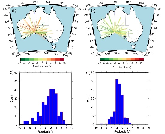 针对地震目录中的地震事件震中定位误差和反演初始速度模型均对地震波走时产生明显影响,他们在该项研究中引入了两项关键技术:1.在层析反演前建立高精度的3-D初始速度模型;2.利用初始3-D速度模型重新定位地震事件。为验证其有效性,他们根据已知地球物理、地质学等信息精心建立了高精度的3-D初始P波速度模型并基于3-D初始速度模型和邻域最优化方法进行了所有地震事件的重新定位。原始的地震事件的震源参数来自于国际地震中心(ISC)和Geoscience Australia的地震目录,通过分析发现,原始相近位置的地震事件从震源到达同一台站的旅行时与1-D理论模型的到时残差呈现出强烈变化的特点,说明原始地震目录给出的地震事件震源参数存在较大误差。经该研究方法进行地震重定位后发现,相近位置的不同地震事件的震相到同一台站的旅行时残差一致,且旅行时残差的正负值与已知上地幔顶部的速度快慢特征等先验信息吻合。他们对6个地真事件(Ground-Truth event, 即通过地表破裂或INSAR等手段已准确获得震源位置的地震事件)进行重新定位并与已知信息进行对比,地震震中定位误差最小为1.1 km,在地真事件定位误差范围内,进而证明了上述提出的地震定位和层析反演流程的有效性。这两项技术极大地降低了地震层析反演的多解性和有效提高了反演的上地幔顶部地震波速度的可靠性。