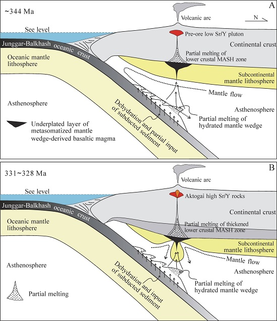 大型斑岩铜矿常与俯冲背景下的高氧化性(氧逸度通常≥NNO+1)岩浆活动有关,且成矿岩石地球化学组成常表现出埃达克质特征(高Sr、低Y及高Sr/Y),明显区别于非成矿岩石-正常弧岩浆(低Sr、高Y及低Sr/Y特征)。因此,埃达克质岩石被认为更有利于形成大型斑岩铜矿。中哈萨克斯坦Aktogai铜矿为全球前25的超大型斑岩铜矿,产于泥盆纪-石炭纪岩浆弧中,为研究成矿前与成矿期岩石属性提供了极佳的研究对象,同时可为探究我国境内斑岩铜矿形成环境提供科学依据。