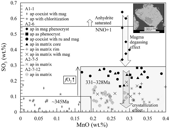 图2 成矿前与成矿期岩石磷灰石MnO-SO3含量相关图解