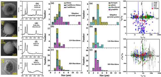 图2 清镇陨石中太阳系外石墨颗粒表现为洋葱型(Onion)、洋葱-花椰菜型(Onion-cauliflower)与花椰菜型(Cauliflower)的形貌以及disordered、glassy和kerogen型的拉曼光谱;并与碳质球粒中的颗粒在形貌、结晶程度、以及C、O和Si等同位素组成上进行对比,推测太阳系外石墨颗粒在太阳星云中可能均匀分布