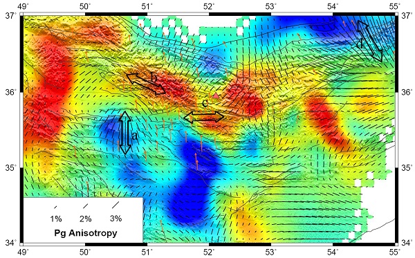 将该地震波速度与各向异性联合反演方法应用于地壳内传播的Pg震相,研究组还获得了伊朗北部Damavand火山以及Sahand-Sabalan火山地区地壳P波横向速度及各向异性结构。研究发现,火山地区地壳P波速度与地幔顶部Pn波速度结构具有显著对应关系,显示了地幔热物质上涌对火山区域地幔顶部和地壳结构的共同影响。Sahand-Sabalan火山区地壳速度结构表明,Sahand火山下方地壳内存在规模更大的岩浆物质存储。